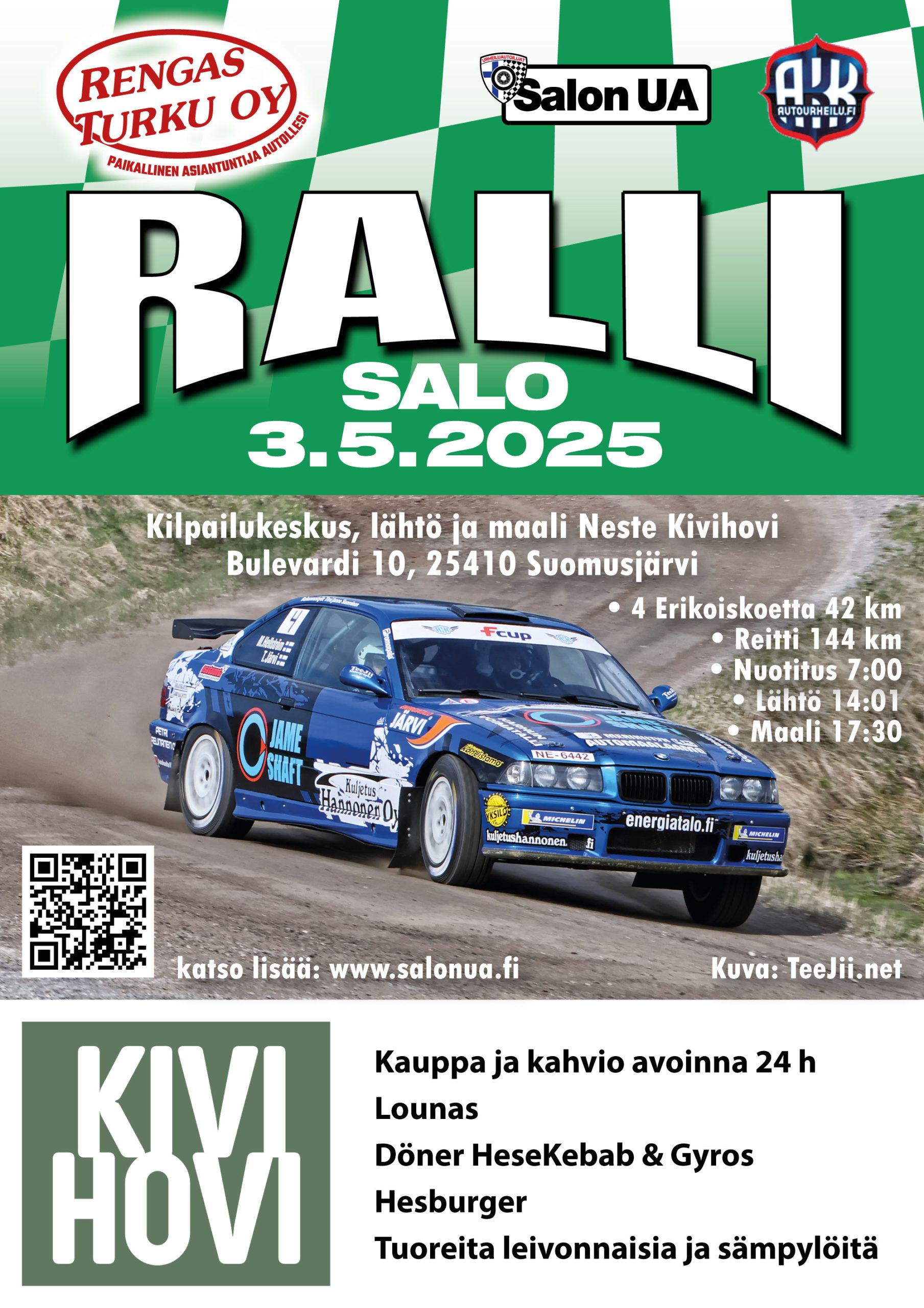 Rallin kesäkauden avauskilpailuna 3.5.2025 ajettava Rengas Turku – ralli on neljän erikoiskokeen kansallinen ralli, joka on samalla alue 7 aluemestaruusosakilpailu. Kilpailun ajankohta on mitä parhain tulla testaamaan kalustoa, sekä avaamaan ranteet ennen sarjojen kilpailuja. Ralli sisältää 4 erikoiskoetta, joiden yhteispituus on n. 42 km ja koko reitin kokonaispituus n. 144 km. Kilpailun vauhdikkaat erikoiskokeet sijaitsevat Varsinais-Suomessa ja Uudellamaalla. Luokkia löytyy niin nuotittaville kuin pimeäänkin ajaville. Koko kilpailu viedään läpi päivän aikana, aloittaen aamulla nuotituksella klo 7:00 – 13:00, lähtö klo 14:01 ja maali n. 17:00. Huolto ja tankkaus siirtymäajalla EK 2 jälkeen kilpailukeskuksessa. Kilpailukeskuksena, lähtönä ja maalina toimii Neste Kivihovi osoitteessa Bulevardi 10, 25410 Suomusjärvi.