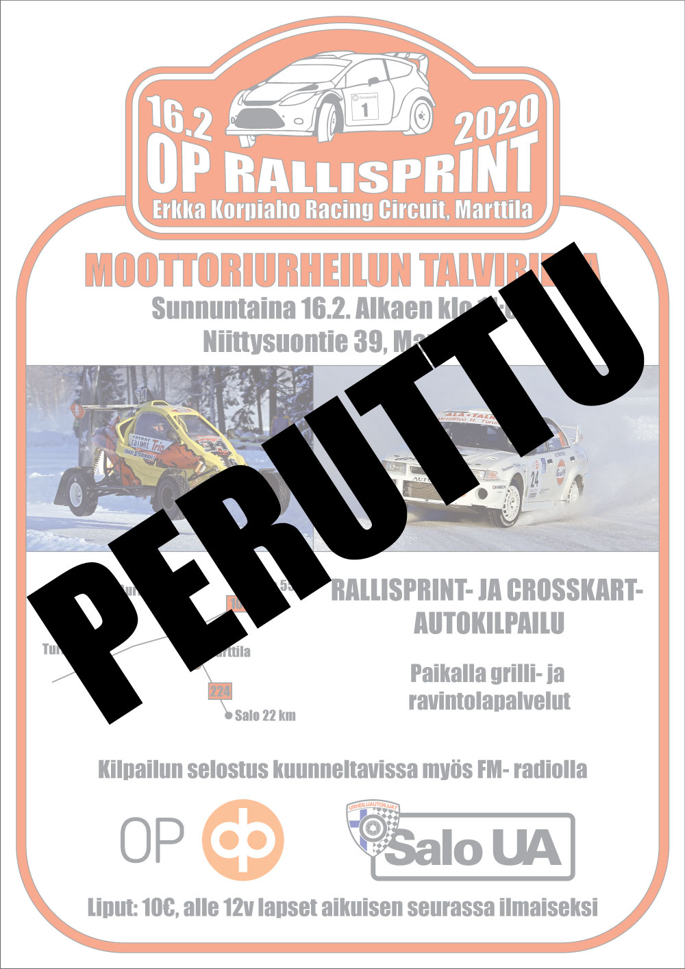 Salon Urheiluautoilijoiden useana talvena järjestämä rallisprint-kilpailu on jouduttu perumaan tältä talvelta keliolosuhteiden vuoksi.